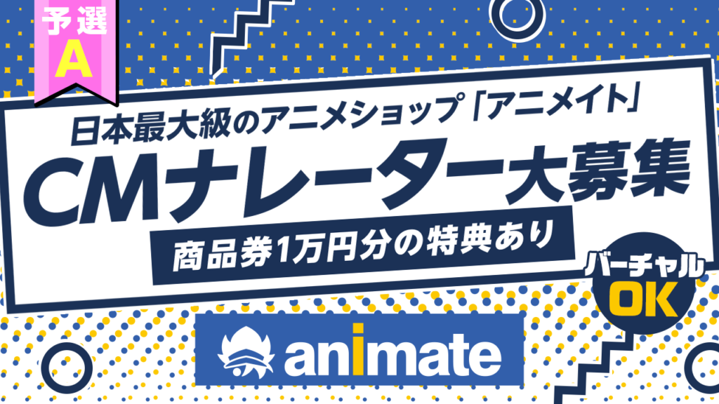 みんな大好きアニメショップ「アニメイト」(全国47都道府県に118店舗以上出店)のCM声優大募集!アニメイトと言ったら知らない人がいないアニメショップ!そこの宣伝を背負う声優になれる!もちろんバーチャルOK!(※現在イベントは終了しております)